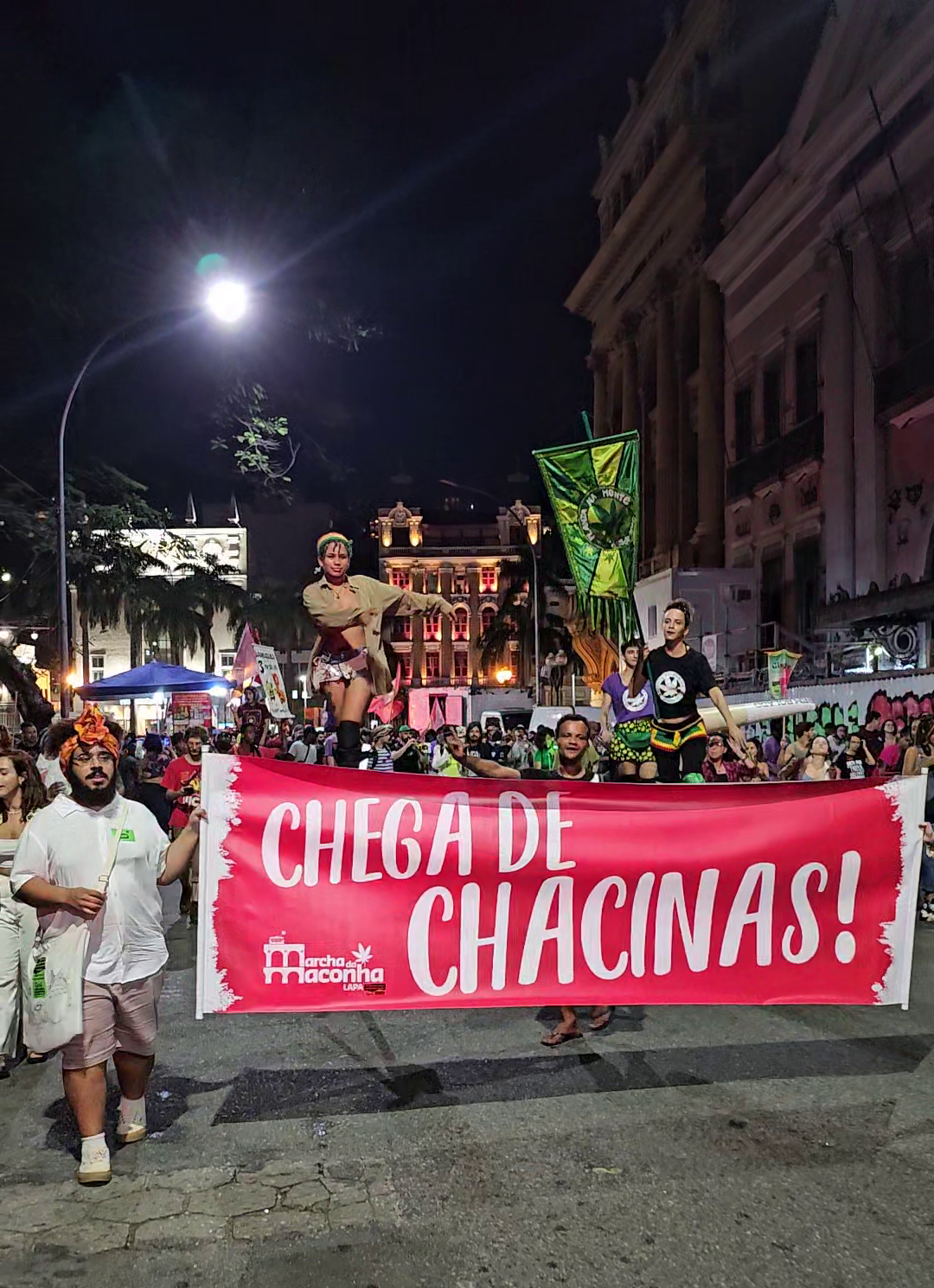 Então, nós reafirmamos: SEM PAZ NAS FAVELAS NÃO EXISTE DEMOCRACIA! O bonde da legalização irá retomar às ruas do Centro, pautando a legalização das drogas, o direito à saúde plena em meio à catástrofe climática e a necessidade da reforma agrária como principal meio para desmantelar o agronegócio.