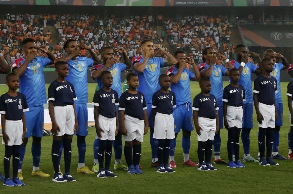 Jogadores da seleção da República Democrática do Congo protestam contra ofensivas do M23 durante a Copa Africana de Nações em 2023. Reprodução: Getty Images.