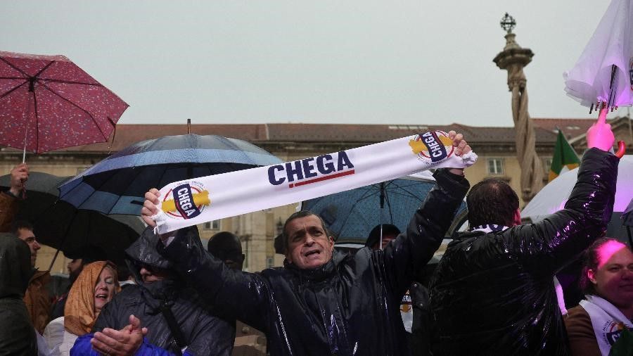 Apoiador do partido de extrema-direita ‘Chega’ em comício em Portugal. Reprodução/Foto: Violeta Santos Moura / Reuters.