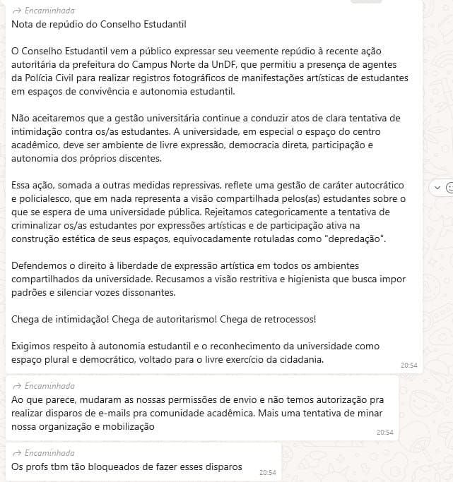 Estudantes da Universidade do Distrito Federal (UnDF) denunciaram uma ação autoritária e intimidatória por parte da administração do Campus Norte da instituição. De acordo com uma nota de repúdio emitida pelo Conselho Estudantil, agentes da Polícia Civil foram chamados ao campus para registrar fotograficamente manifestações artísticas de alunos em espaços de convivência e autonomia estudantil.