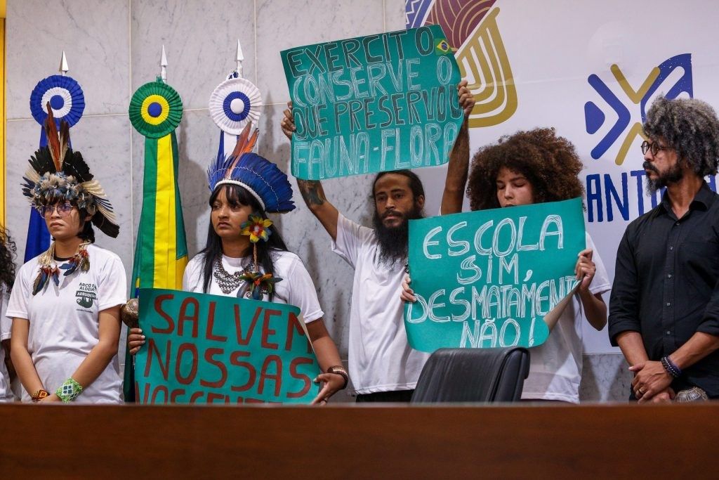 Após ser alvo de críticas por não se pronunciar sobre a ESA, a governadora Raquel Lyra, convoca por decreto um grupo de trabalho (GT) em 2023 com apenas uma cadeira para a sociedade civil, sendo logo criticada por querer debater o tema sem participação popular alguma no processo. No mesmo ano, o deputado Renato Antunes (PL), que por coincidência ou não, serviu no exército por 8 anos, convocou uma audiência pública na ALEPE para, em tese, debater com a sociedade Pernambucana sobre o tema da ESA na APA. Na primeira sessão (figura 9), a sociedade civil não teve lugar na mesa, que foi composta por Exército, Governo de Pernambuco e deputados apoiadores do projeto. Ainda nessa sessão, o exército apenas apresentou o projeto da escola deixando as perguntas feitas pela sociedade civil sobre o desmatamento e compensação em aberto.