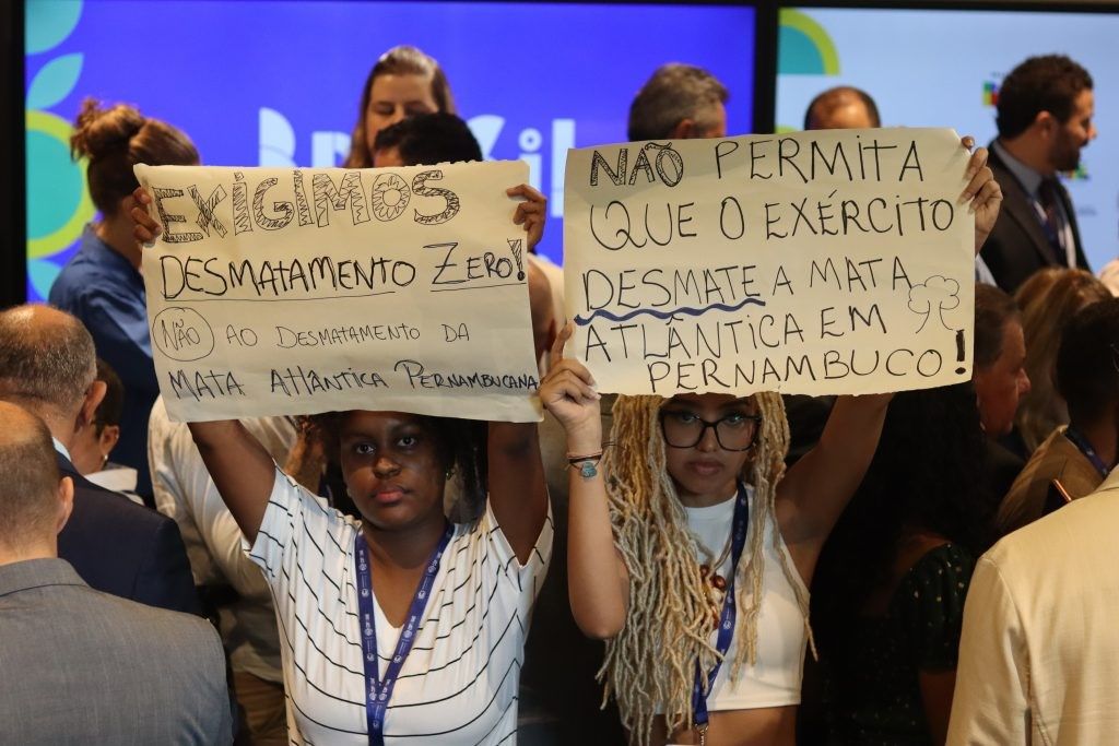 Desde sua criação, o movimento realizou diversas intervenções e têm tentado “furar a bolha” do socioambientalismo e aparecer nas diversas mídias para chamar atenção sobre a questão da APA em Pernambuco. Por exemplo, em dezembro de 2023, durante a COP28 Raquel Lyra passava a imagem de que era uma governadora conservacionista para os gringos que a assistiam, no entanto, foi confrontada por ativistas parceiras do SAAB sobre a ESA, constrangendo a governadora ao criticar sua hipocrisia no evento internacional (figura 11). Outros diversos momentos de intervenção foram feitos nas ruas, nas universidades, em outdoors e também em momentos institucionais.
