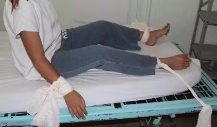 Paciente com pés e mãos amarrados no HSVP, no DF — Foto: MNPCT