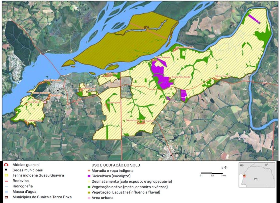Atualmente, plantações de soja e milho ocupam a maior parte desta TI, conforme Mapa de Uso e Ocupação do Solo abaixo. Segundo o relatório "Impactos da produção de commodities agrícolas às comunidades Avá-Guarani da Terra Indígena Tekoha Guasu Guavirá/Oeste do Paraná", cerca de 60% da área é destinada a atividades agropecuárias, enquanto apenas 12,4% da vegetação nativa original ainda existe. O restante do território é ocupado por plantações de eucalipto (2,8%), áreas de água (22,8%), zonas urbanas (0,13%) e pequenas áreas com moradias e roças indígenas (1,13%). O estudo, realizado pela Comissão Guarani Yvyrupa (CGY), alerta para o acesso restrito dos Avá-Guarani ao território, essencial para sua cultura e subsistência, muitas vezes bloqueado por proprietários privados.