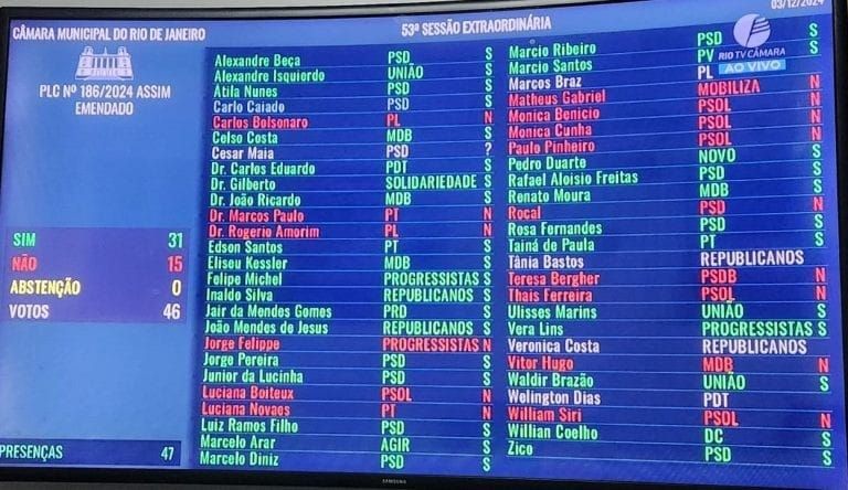 Painel da Câmara com o resultado da votação do PLC 186/24. Foto: Imprensa e Comunicação do Sepe/RJ.