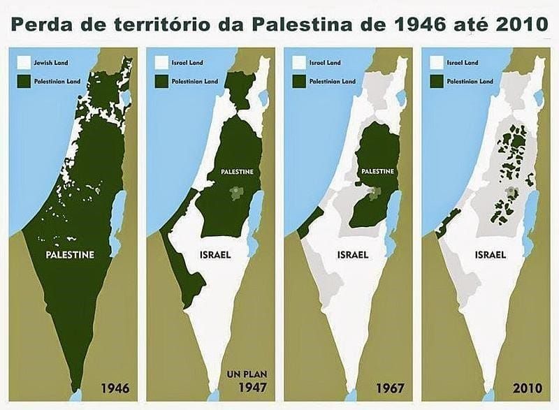 Fronteiras políticas entre a Palestina e a ocupação sionista desde 1948. Reprodução: Brasil de Fato.