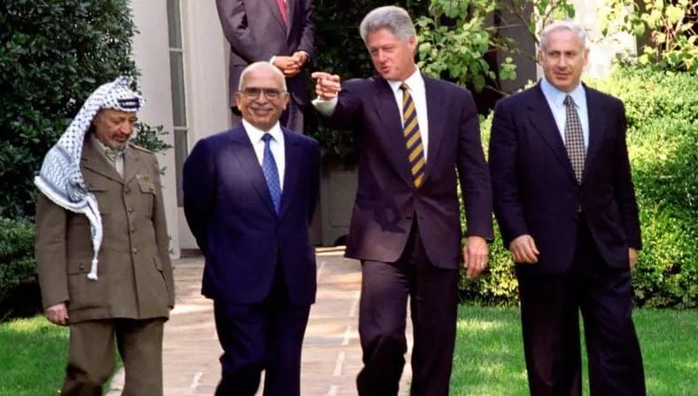 Da esquerda para a direita: o presidente da OLP, Yasser Arafat, o Rei Hussein da Jordânia, o presidente dos EUA, Bill Clinton, e o primeiro-ministro israelense, Benjamin Netanyahu, em 1996.