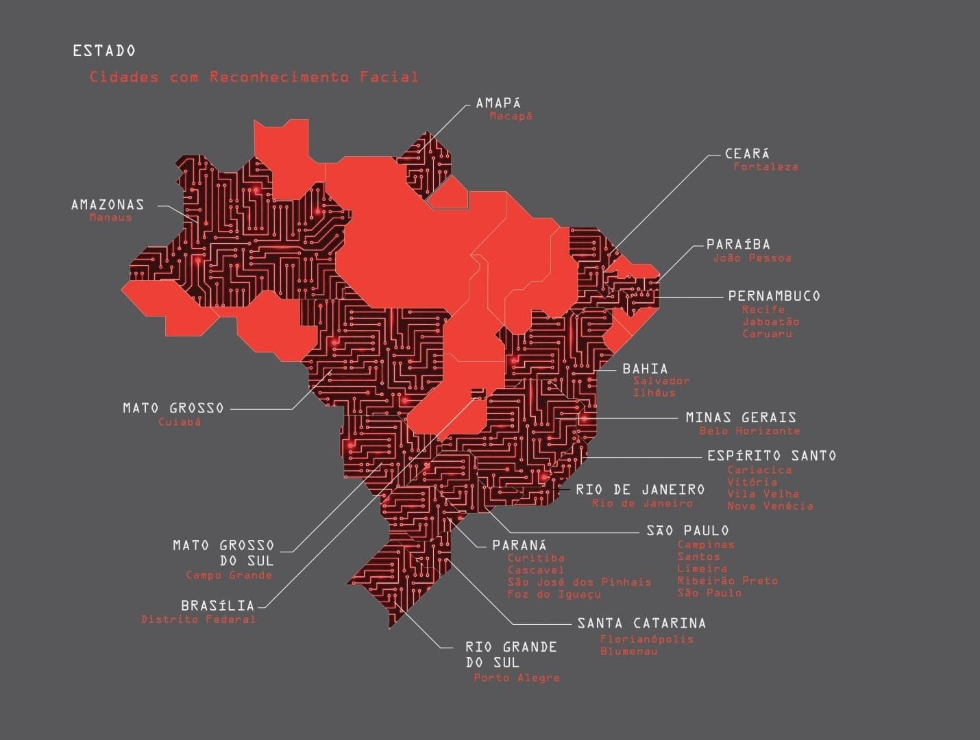 Desde 2011, com destaque a partir de 2019, vários estados do país começaram a implementar a tecnologia por meio de contratos fechados pelos Governos Estaduais junto a empresas do Brasil (Teltex e Oi), China (Huawei), Espanha (Iecisa) e Israel (Corsight e Cellebrite). Embora as justificativas formais se ancorem, principalmente, na identificação de suspeitos e desaparecidos, o objetivo central está na vigilância e no controle da população - especialmente de seus setores mais marginalizados – e no lucro das grandes empresas de tecnologia.