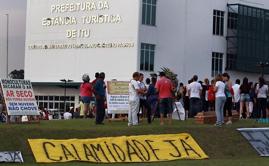 Manifestação em frente à Prefeitura de Itu exigindo que o executivo declarasse estado de calamidade pública em setembro de 2014. Reprodução/Foto: Juca Varella.