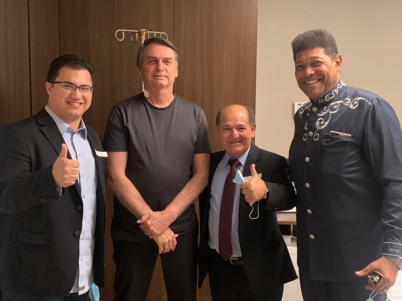 Rodrigo Moraes (PL) à esquerda, ao lado de Jair Bolsonaro, seu pai, Missionário José Olímpio (ex-deputado federal pelo então Democratas) e o apóstolo Valdemiro Santiago. Reprodução/Foto: redes sociais.