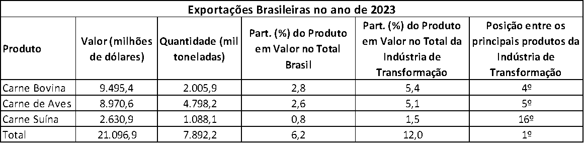 A participação dos frigoríficos é expressiva na balança comercial brasileira (Tabela 1). A exportação de carne bovina, de aves e suína somadas foi equivalente a 21,1 bilhões de dólares (superior a 100 bilhões de reais) e 7,9 bilhões de toneladas em 2023. Se consideradas em conjunto, ocupam o primeiro lugar entre os produtos exportados da indústria de transformação brasileira. Se separadas, a exportação de carne bovina e de carne de aves ocupam a quarta e quinta posição, respectivamente.