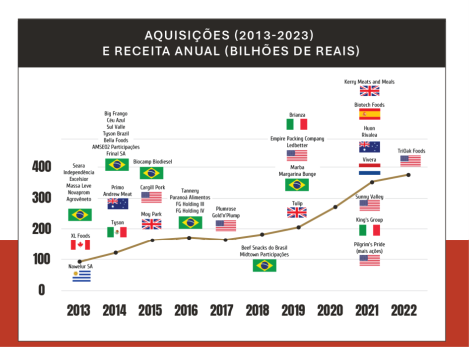 Figura 2: Aquisições e Incorporações (2013-2023) vs. Faturamento anual (bilhões de reais) da JBS. Fonte: PINA (2024, p. 21)
