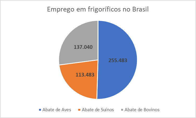 Há mais de 500 mil trabalhadores e trabalhadoras ocupados em frigoríficos no país (Figura 3). Segundo Pina (2024), somente a JBS emprega 113 mil operários, mas a autora não especifica se todos estão nos frigoríficos. De todo modo, a média salarial dos operários da JBS é de R$ 1.700,00, segundo estudos de Pina com base em atas de acordo coletivo em 12 estados brasileiros. Isto é equivalente a pouco mais de um salário mínimo federal.