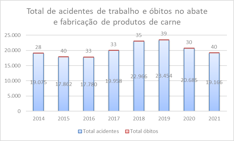 Quanto às denúncias das condições de trabalho, destacam-se os casos de adoecimento e acidentes de trabalho (ALIAGA et al, 2021; RAMOS, 2023). O trabalho em abates é o terceiro em número de Comunicados de Acidentes de Trabalho (CAT) no Brasil, mesmo com a estimativa de subnotificação na ordem de 70% a 90% (ANPT, 2017). São cerca de 20 mil acidentes por ano (Figura 4).