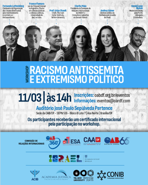 A Ordem dos Advogados do Brasil do Distrito Federal (OAB-DF) lançou um workshop para o dia 11 de março para debater o “Racismo Antissemita e Extremismo Político”. O evento é uma parceria da Ordem com a Embaixada de Israel em Brasília, Associação Cultural Israelita de Brasília, Academia Judaica, Universidade de Tel Aviv, e a Confederação Israelita do Brasil.