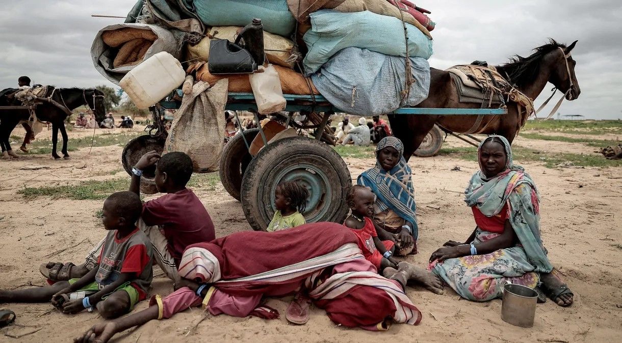 Família de deslocados sudaneses aguarda para ser registrada pelo ACNUR na fronteira com o Chade. Reprodução: Redes Sociais.