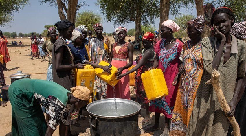 Pessoas no campo de deslocados de Gomgoi coletam água. Reprodução: ACNUR.