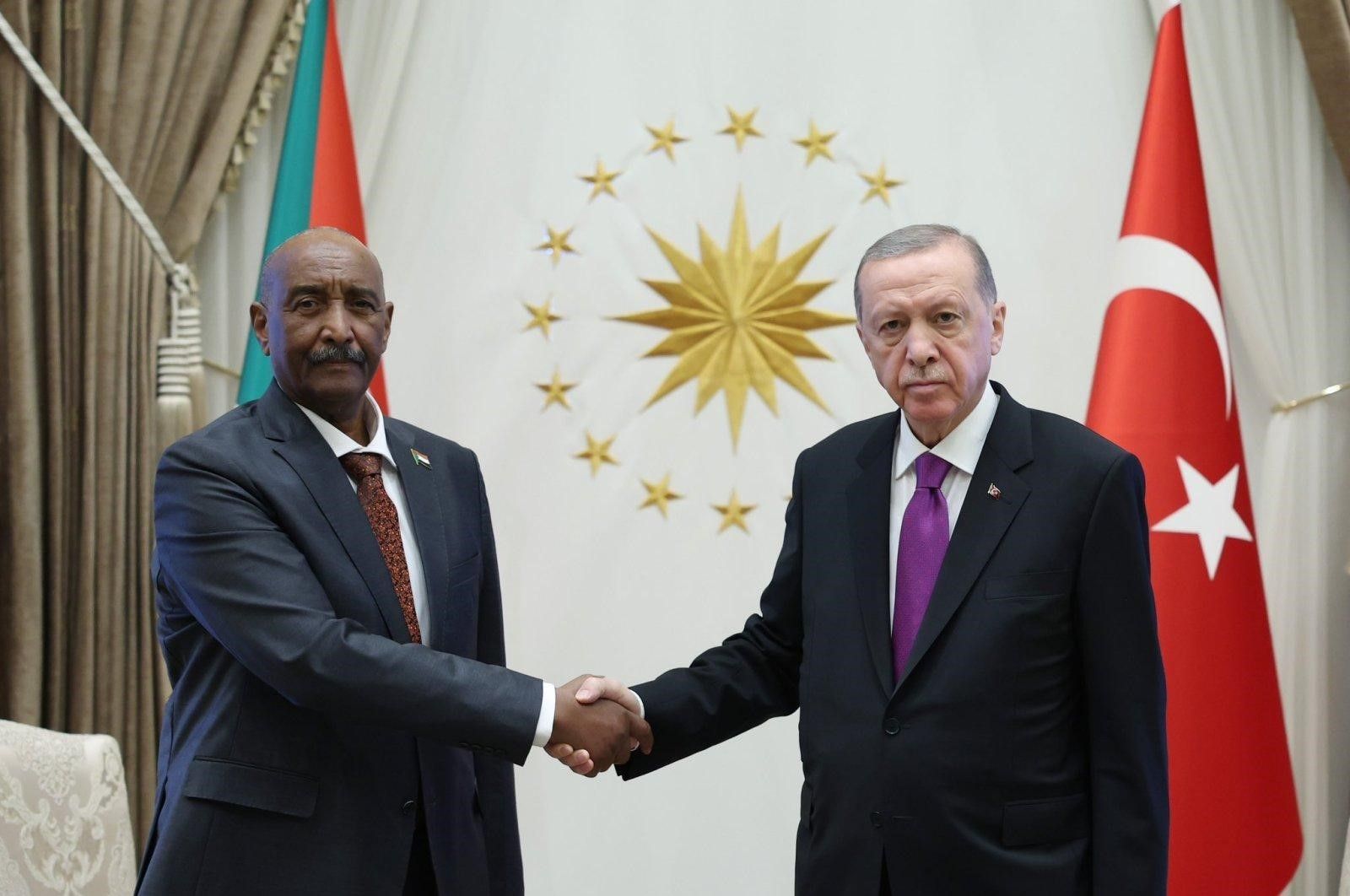 O presidente turco Erdoğan recebendo o líder militar sudanês, general Abdel Fattah al-Burhan, no Complexo Presidencial em Ancara em 13 de setembro de 2023. Reprodução: Getty Images.