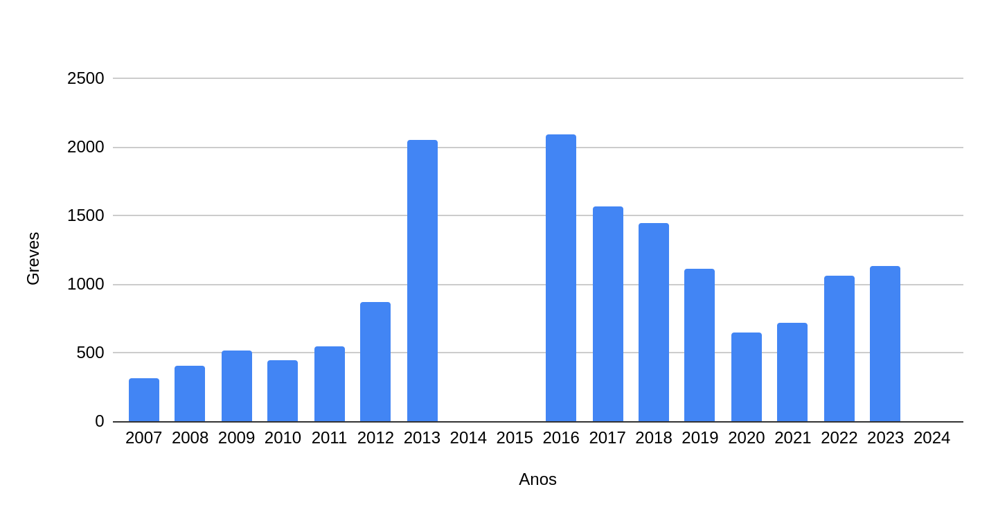 Segundo os balanços de greves do DIEESE, podemos distinguir claramente um momento de ascensão grevista a partir dos impactos da crise internacional do capitalismo. Se pegarmos a série desde 2013 (ano das Jornadas de Junho), e excluirmos os dois anos de pandemia (2020 e 2021), por sua excepcionalidade, e os dois anos cujos balanços não foram publicados (2014 e 2015), temos uma média de quase 1500 greves por ano – o triplo da maior quantidade anual de greves do governo Lula II.