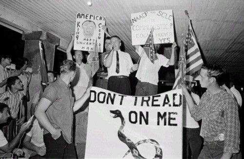Manifestação da Ku Klux Klan (KKK) em 1964 bradando a "Gadsden Flag". Reprodução/Foto: Esquerda Diário.