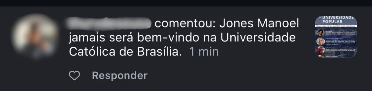 Enquanto as redes da UCB Popular divulgava a mesa “Ensino, pesquisa, extensão e a Universidade Popular” com o Jones Manoel, um dos comentários ao post dizendo que “Jones Manoel jamais será bem-vindo na Universidade Católica de Brasília” (sic) chamou a atenção por se tratar de um jovem estudante da universidade com o lema “Don’t Tread on Me” – ligada a movimentos nazifascistas e supremacistas estadunidenses - em sua bio do Instagram.