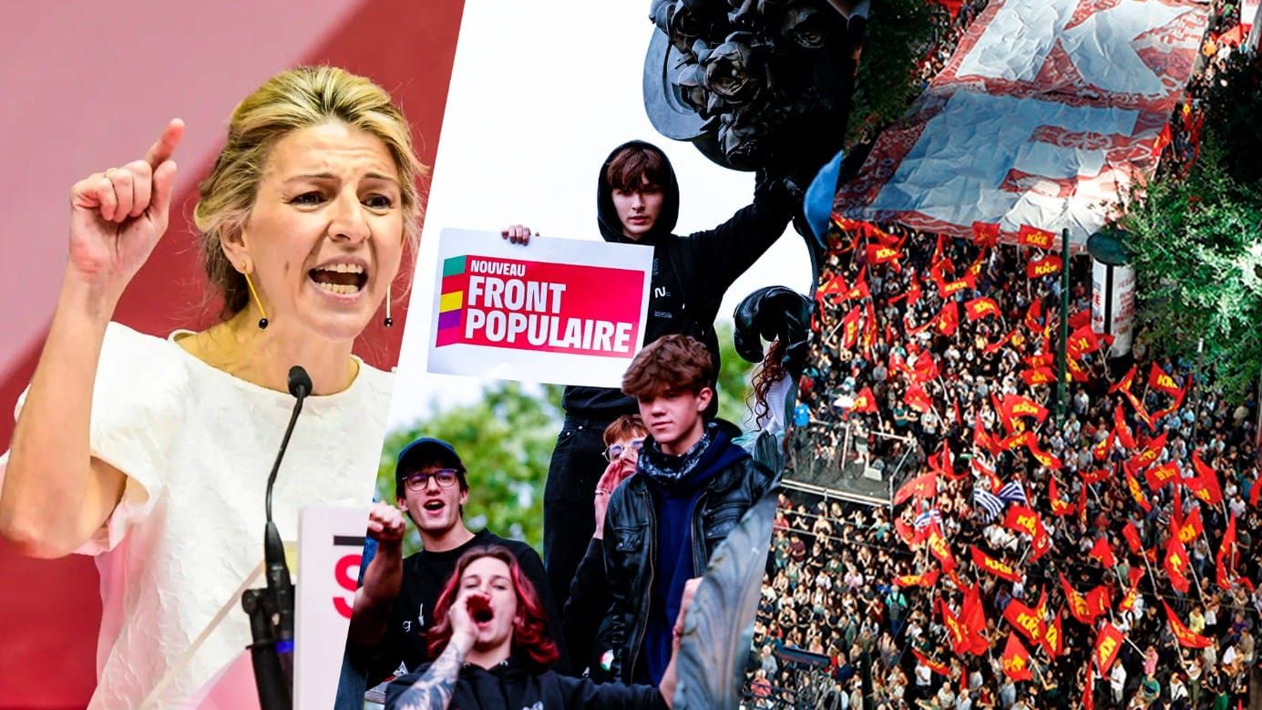 Da esquerda para a direita: a representante da nova esquerda espanhola, Yolanda Díaz, apoiadores do Nouveau Front Populaire na França e as manifestações do Partido Comunista Grego em Atenas.