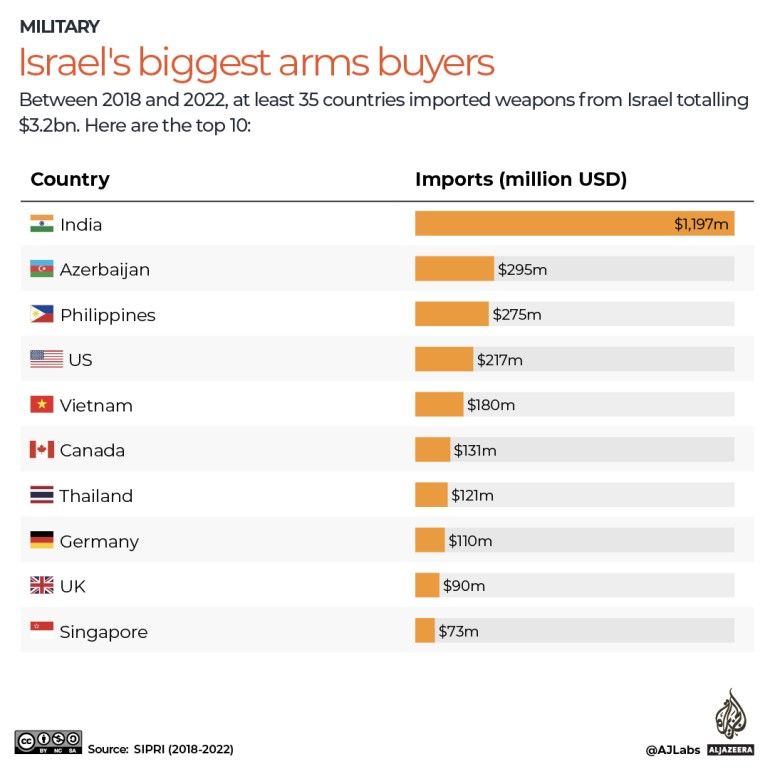 Em gráfico feito pela Al Jazeera, Vietnã foi o 5º maior comprador bélico de Israel entre 2018 e 2022.