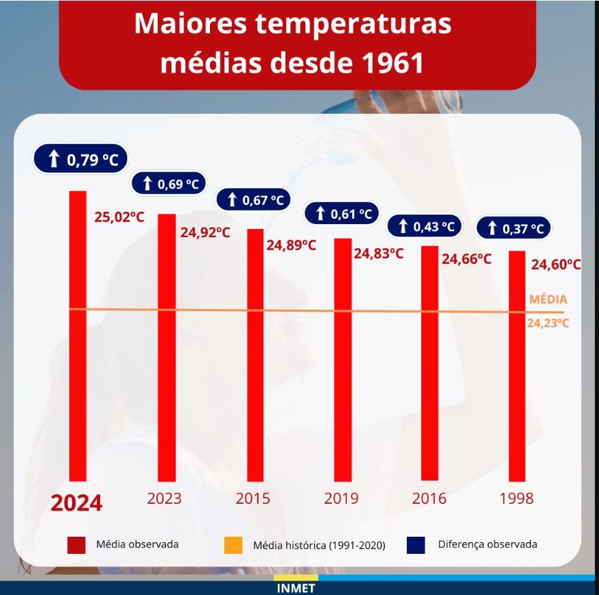 No Brasil, o Instituto Nacional de Meteorologia (INMET) registrou uma temperatura média de 25,02°C no ano passado. O número é o mais alto desde 1961, quando a medição nacional começou a ser feita, e está 0,79°C acima da média histórica, que abrange o período de 1991 a 2020.