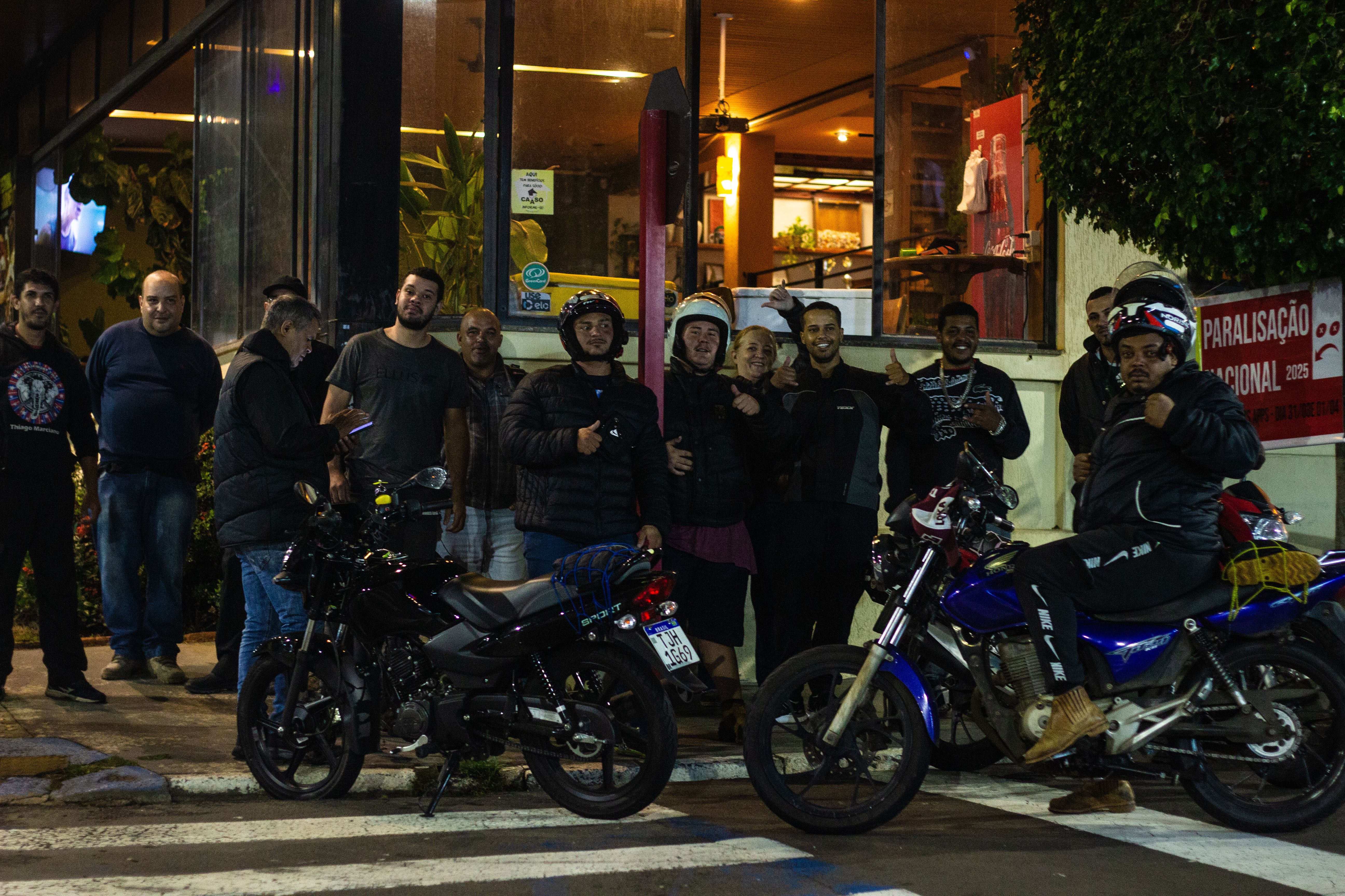 Entregadores reunidos durante o período noturno do dia 31 de março, e mobilizando o breque nos estabelecimentos. Foto: Marcelo Hayashi/Jornal O Futuro