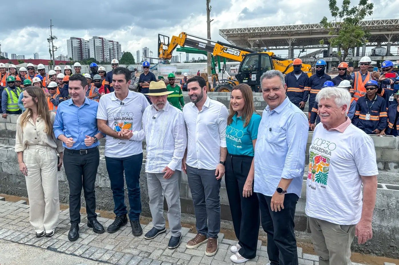 Da esquerda para a direita Laize Lazera (Esposa de Jader Filho), Jader Filho Barbalho (Ministro das Cidades), Helder Barbalho, Lula, Igor Normando (Prefeito de Belém e primo de Helder), Hanna Ghassan (Vice Governadora) Rui Costa (Ministro da Casa Civil) e Airton Faleiro (Dep. Federal - PT). Reprodução/Foto: Agência Pará.