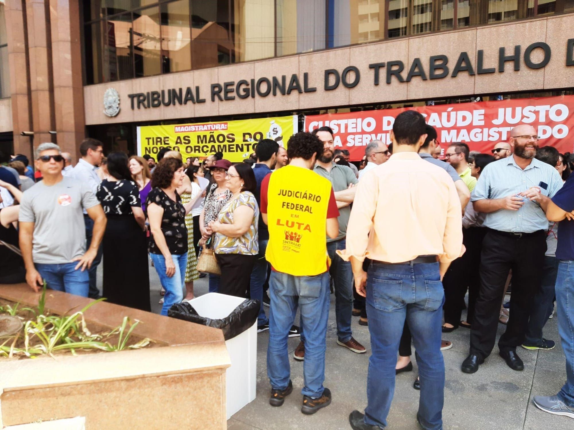 Servidores do TRT-15 reunidos para assembleia sindical em frente à sede do tribunal. Fotos: Jornal O Futuro.