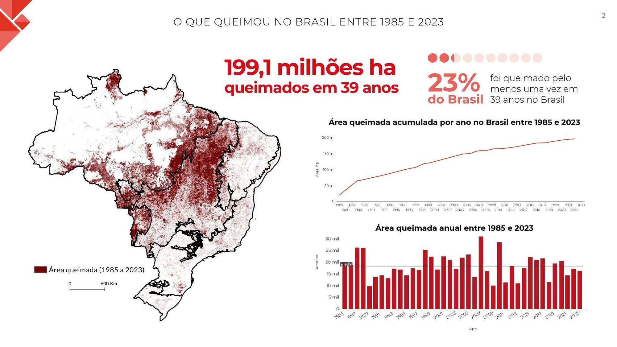 A recente edição da Coleção MapBiomas Fogo apresenta dados alarmantes sobre a extensão das áreas queimadas no país. Entre 1985 e 2023, 199,1 milhões de hectares foram queimados em pelo menos uma ocasião. O que representa quase um quarto do território nacional.