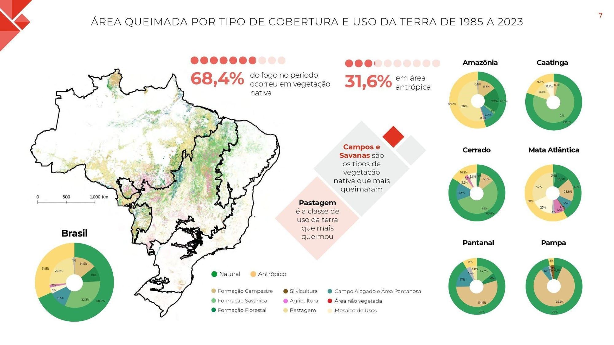 Outros dados que chamam atenção para compreender a dimensão do problema é a relação das queimadas com o tipo de cobertura e uso da terra e com o tipo de imóvel. Mais de dois terços (68,4%) do fogo no período ocorreu em vegetação nativa, enquanto 31,6% ocorreram em áreas antropizadas. Os imóveis privados foram responsáveis por 60% da área queimada.